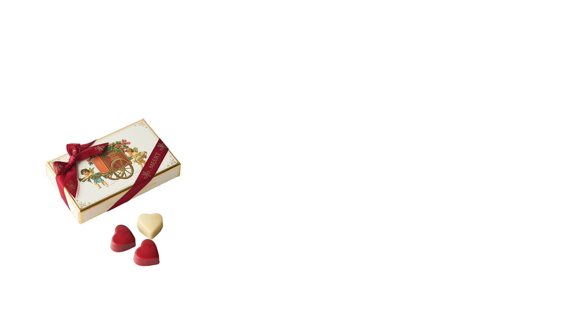 Chocolate hearts : 6 white hearts (almond praliné) et 6 red hearts (passionfruit ganache).