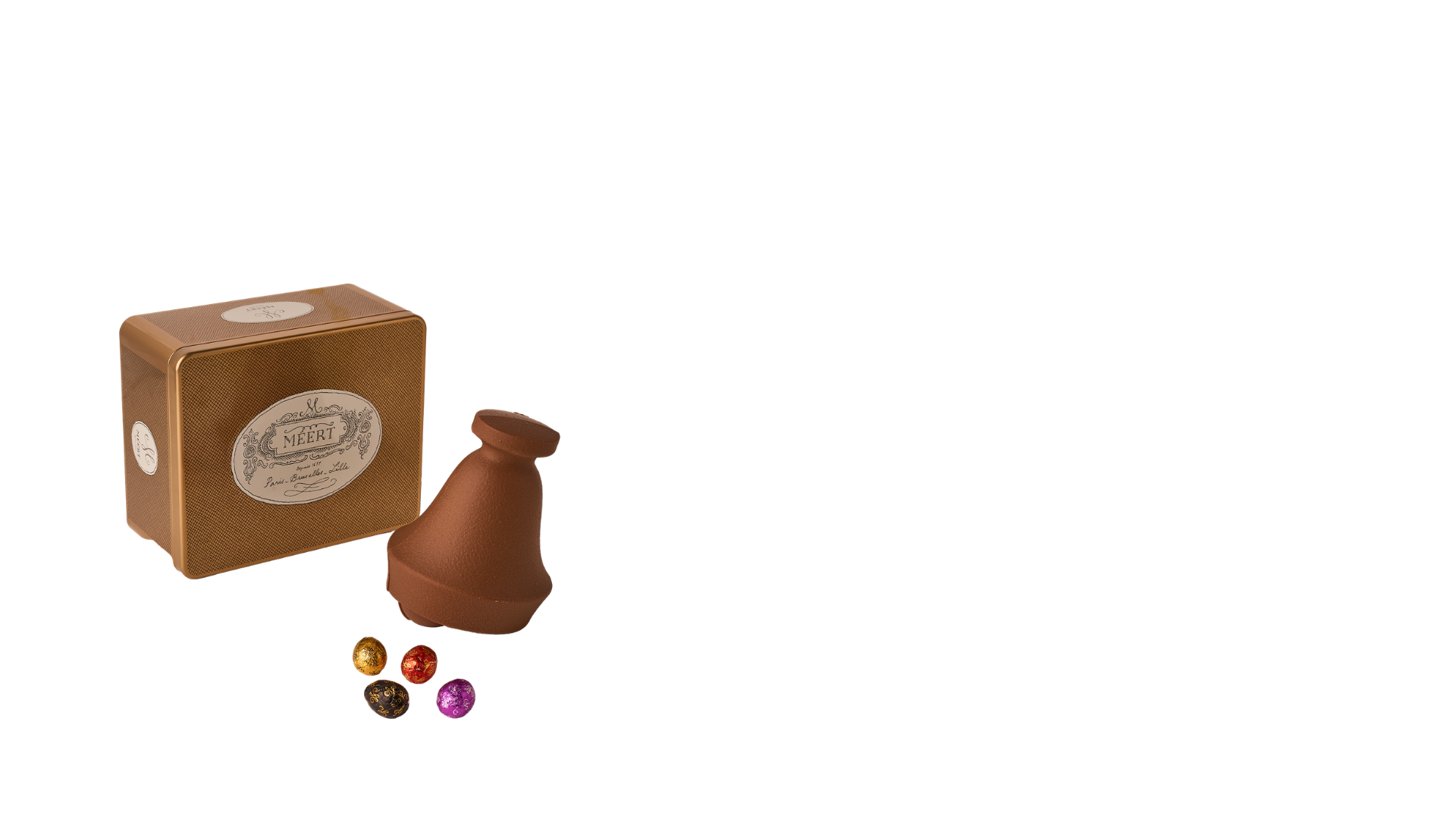Milk chocolate Easter Bell with little chocolate eggs (milk chocolate, dark chocolate and white chocolate).