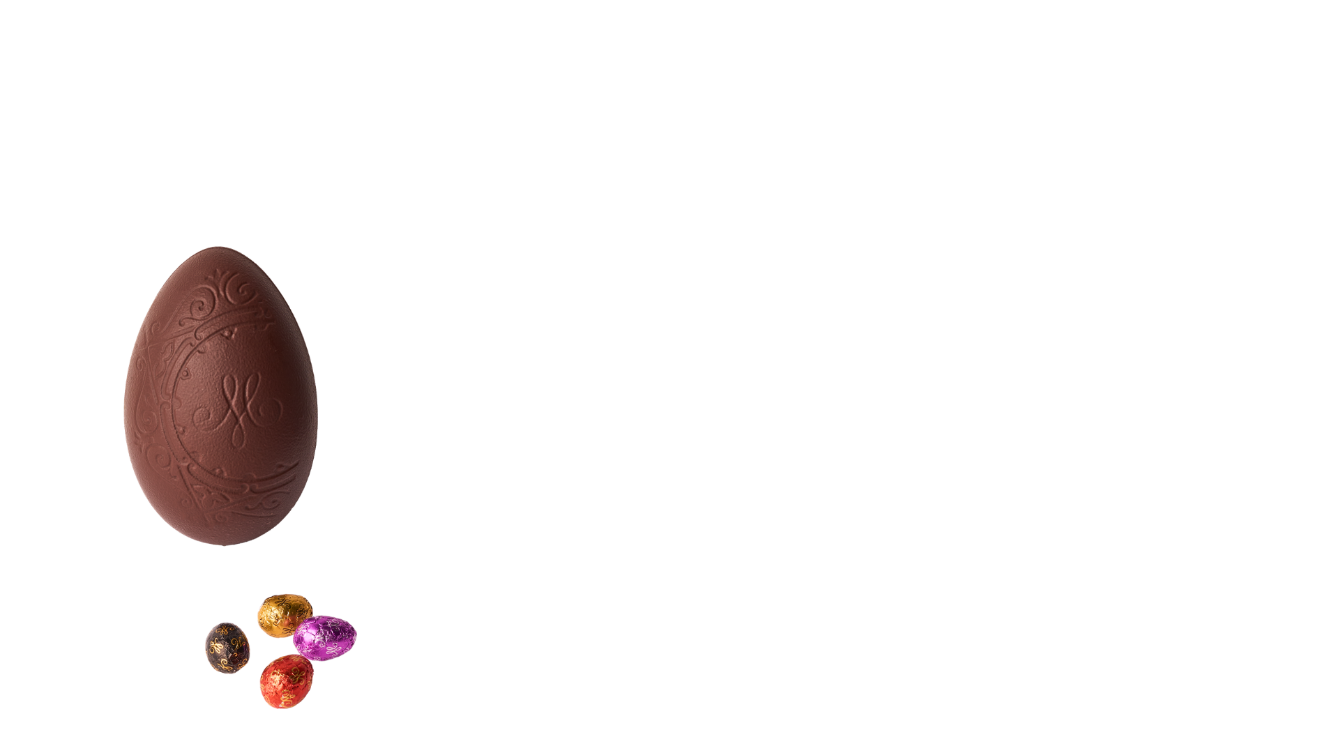 Œuf de Pâques en chocolat noir garni d'un assortiment de petits oeufs (chocolat noir, au lait et blanc).